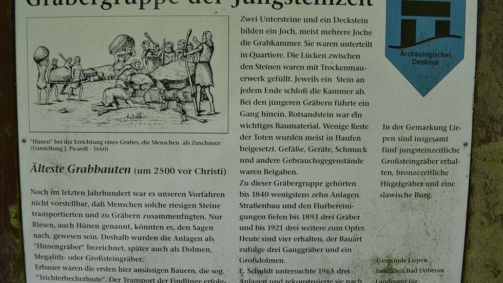 Die Großsteingräber an der Recknitz bei Liepen gehören zu den besterhaltensten Bauwerken aus der späten Jungsteinzeit (3500 - 2800 v.u.Z.). Sie sind damit die ältesten Zeugnisse menschlicher Baukunst in dieser Region. Bei Ausgrabungen in den 1960er Jahren sind Gefäße, Klingen, Pfeilspitzen, aber auch Bernsteinperlen gefunden worden.