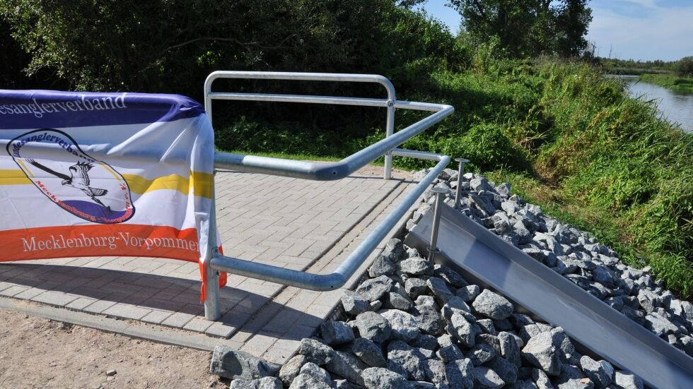 Im idyllischen Flussgebiet der Recknitz, gleich hinter Marlow an der L 18, der Straße nach Semlow, befindet sich der behindertengerechte Angelplatz. Er ist über eine befestigte Zufahrt von der Straße aus zu erreichen und mündet in einen kleinen Parkplatz, ausreichend für gut zwei Autos. Von dort können die Menschen mit Handicap barrierefrei direkt ans Wasser gelangen. Im Zuge der Bauarbeiten wurde das Ufer gesichert und eine Plattform aus Naturwasserbausteinen errichtet. Die ist umringt von einem Geländer, das vor Wegrollen oder Abrutschen schützt und in der Mitte etwas abgesenkt ist, damit die Anglerinnen und Angler ihre Ruten auch im Sitzen leicht auswerfen können. Vom Wasser aus bis hinauf zu dieser erhöhten Plattform führt eine Rutsche für Fische, damit unsere gehandicapten Petrijünger ihren Fang ungehindert anlanden können.