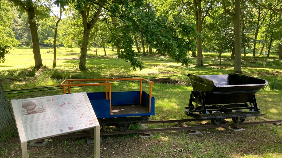 Lore auf Schienen - damit ist früher Torf als Brennmaterial zum Verdunsten der Sole aus den umliegenden Mooren geholt worden.
