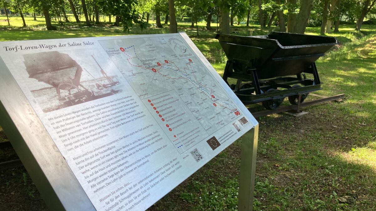 Mit diesen Loren Wagen wurden die Torfsoden von den Torfeinschiebefrauen vom Prahm an der Recknitz, wenige hundert Meter von hier, zum Hitzhals der Feuerungsstelle gekarrt. Die Saline verschlang zum Sieden des Salzes Millionen von Torfsoden. Die wurden hauptsächlich im Langsdorfer Moor gewonnen. Hier arbeiteten durch den Sommer 200 Menschen.