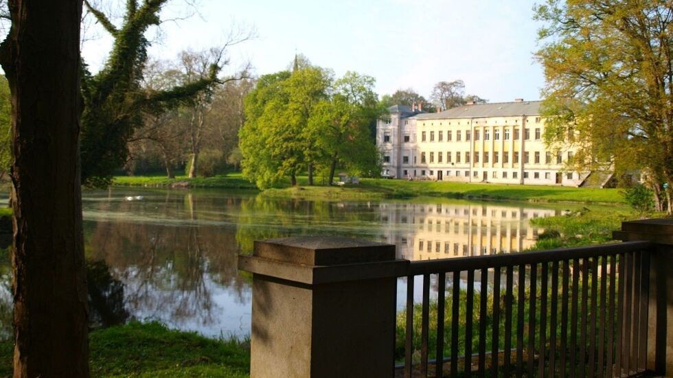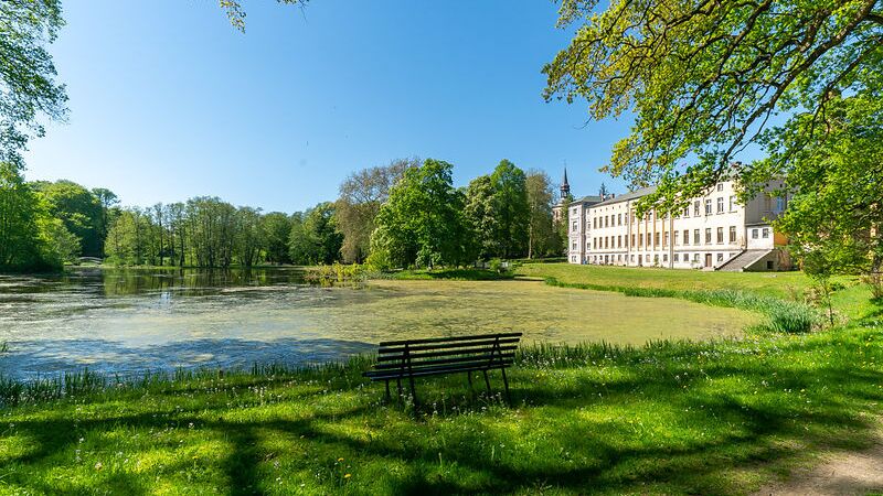 Der zu jeder Jahreszeit wunderschöne ca. 21 ha umfassende Park mit seinem großen Teich enthält viele dendrologische Besonderheiten. Er wurde 1852 von Gustav Meyer im englischen Stil angelegt - weite Wiesenräume, ausgedehntes Wegenetz mit Sichtachsen zum Schloss, System von Gräben und Teichen mit sieben Brücken. Heute ist der Park einer der wenigen erhaltenen Gärten des königlich-preußischen Hofgärtners. Den Mittelpunkt bildet ein großer Teich, der 1853 anstelle einer sumpfigen Wiese entstand.
