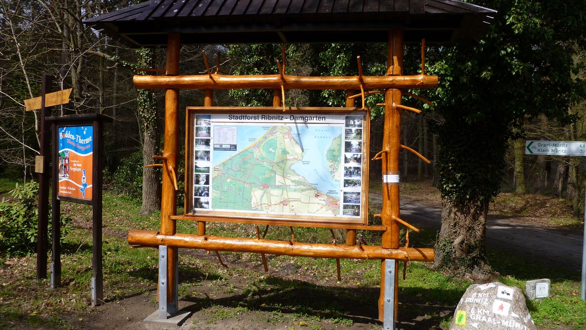 Im Erdgeschoss des Informations- und Schulungszentrums "Wald und Moor" im Stadtforst Ribnitz-Damgarten finden sich auf rund 100 m² Ausstellungsräume mit Wissenswertem über die Entwicklung des Ribnitzer Großen Moores vom Toteisloch zum Hochmoor sowie über den Lebensraum Wald.